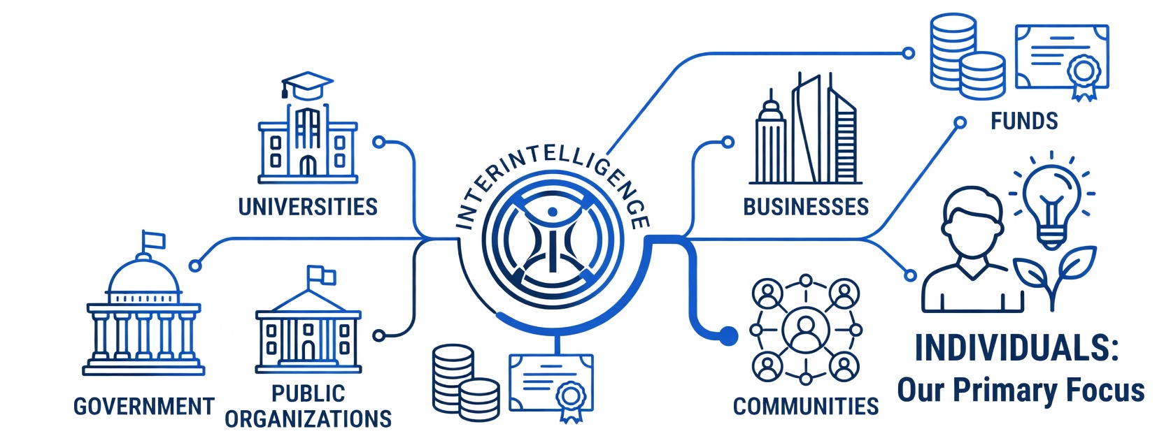 We leverage a diverse and interconnected ecosystem of partners, from universities and governments to public organizations, all aimed at one goal: to create personalized opportunities for growth and development that make intellectual resources accessible to every individual.